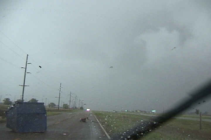 debris had made it into the I-27 service road, including a dumpster and a lawn